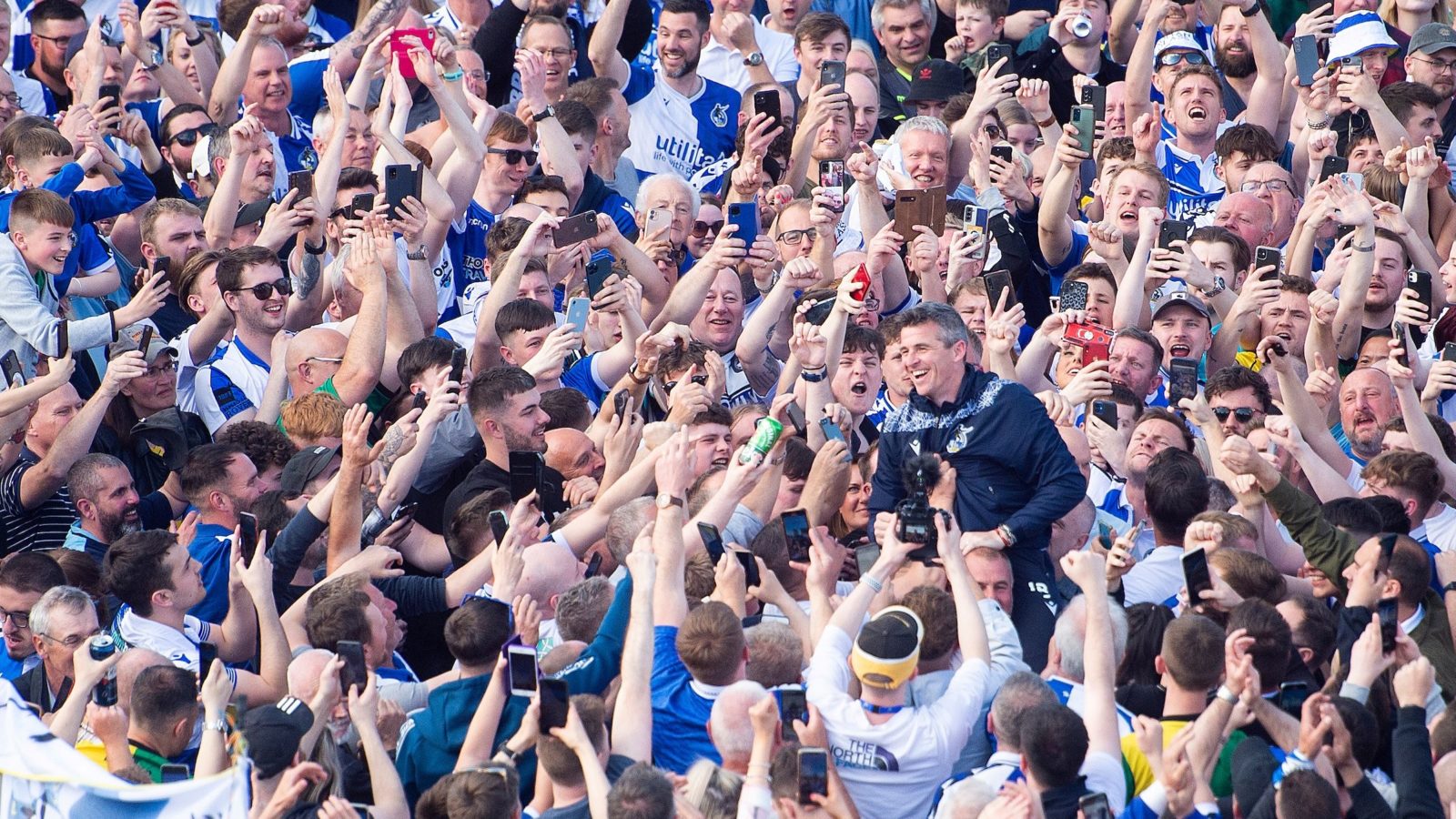 Joey Barton was held aloft by fans on the Memorial Stadium pitch under a fog of blue smoke from flares on a day which will go down in Bristol Rovers history.
