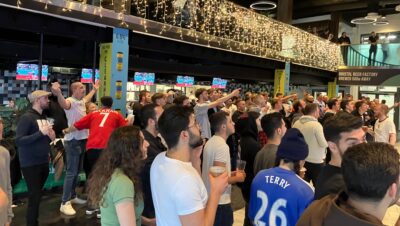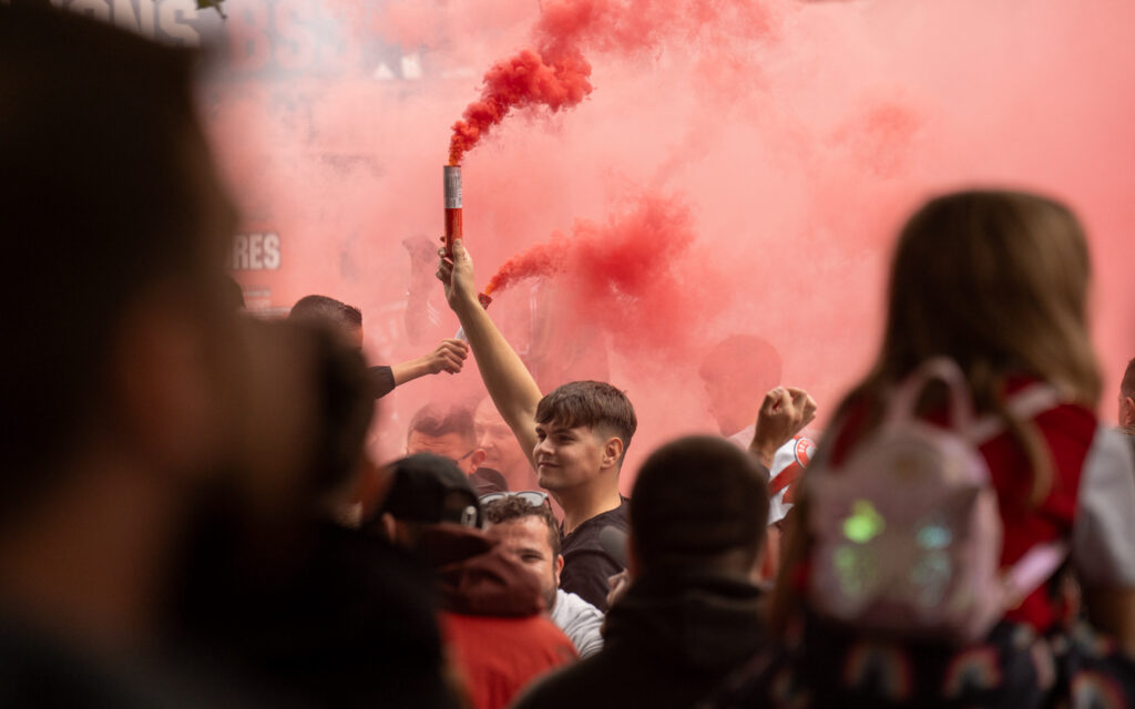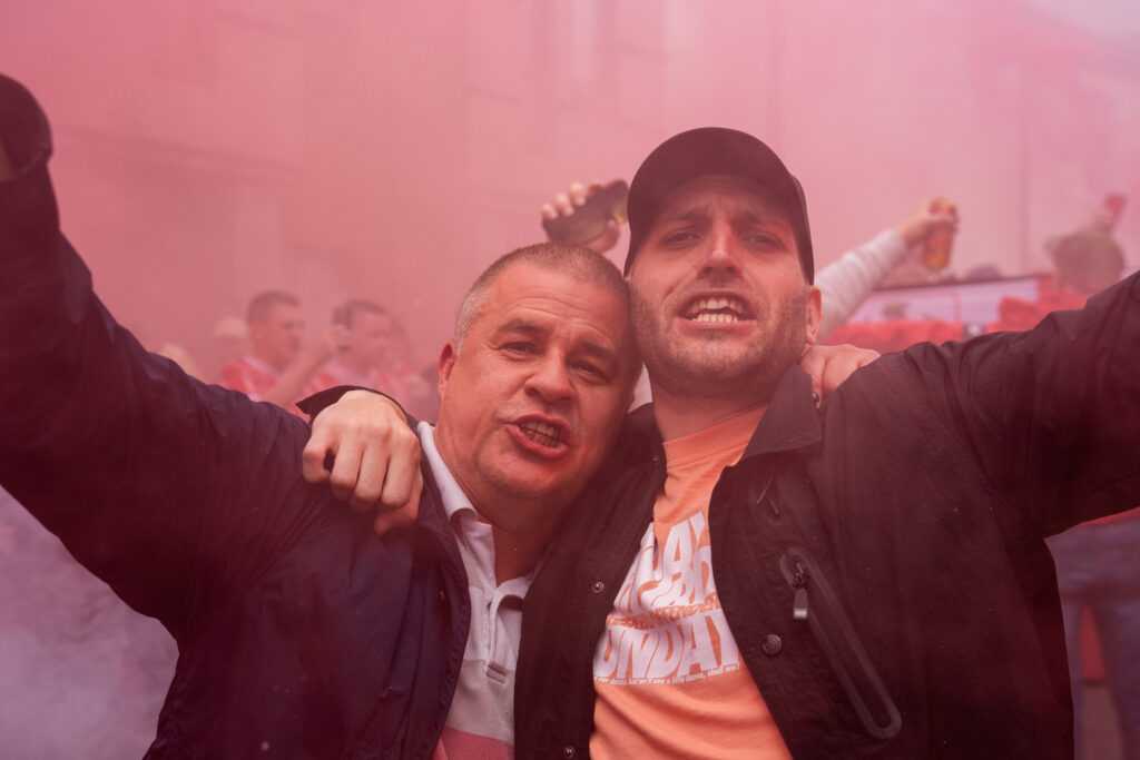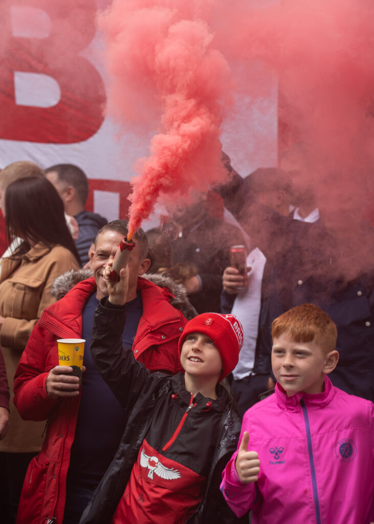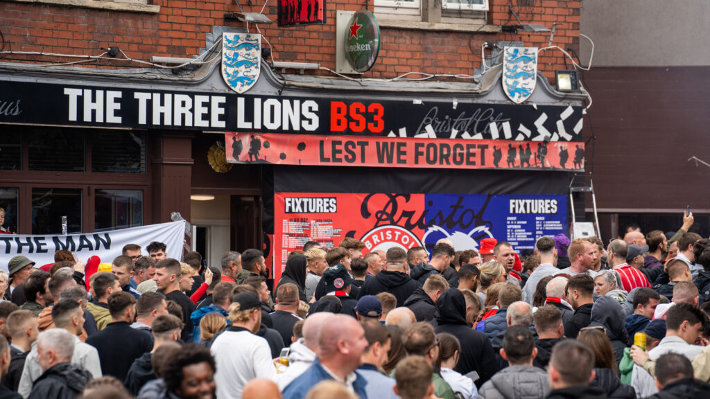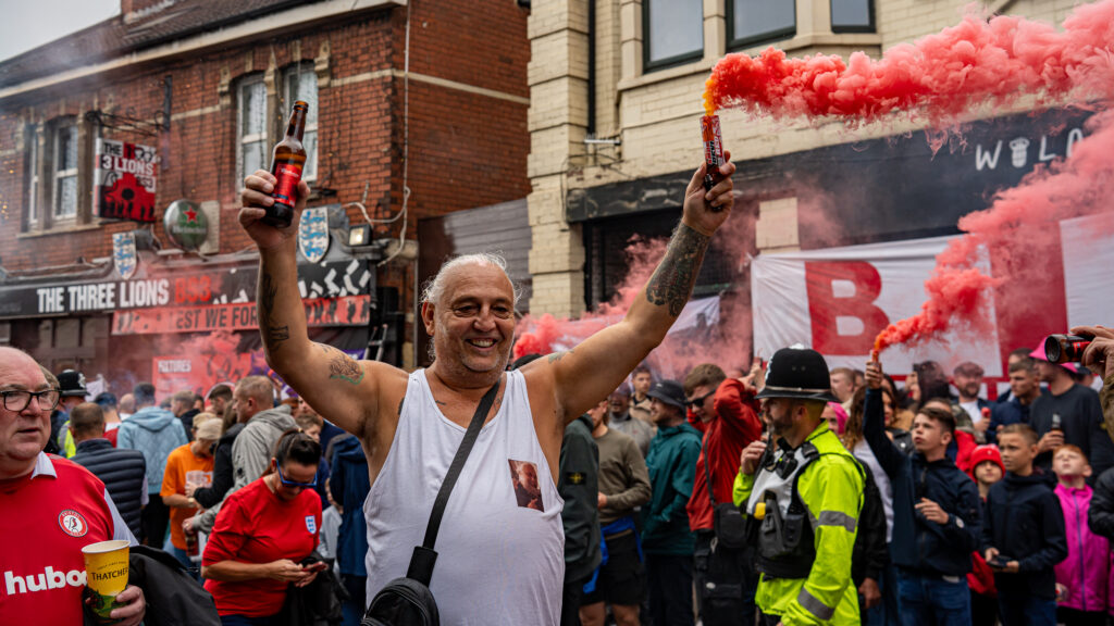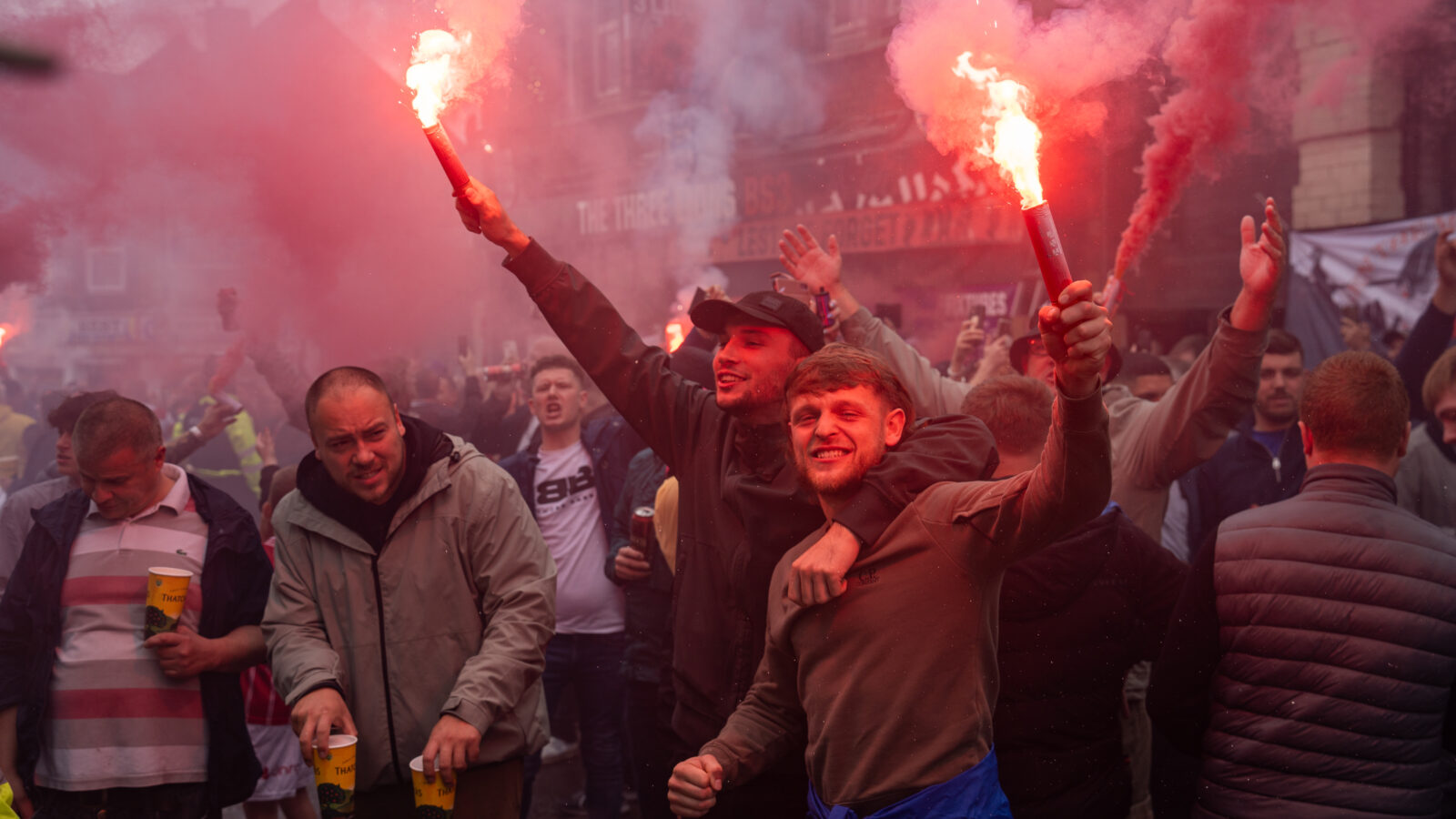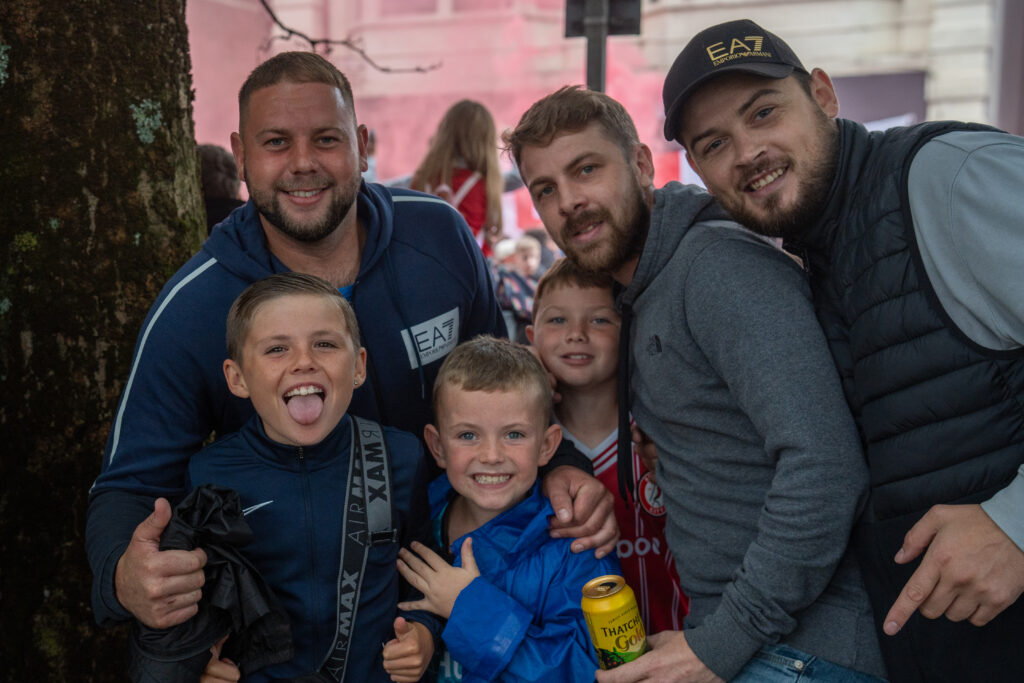 Hundreds of fans gathered in front of the pub, with police on foot initially keeping fans off West Street before they spilled onto the road with smoke from red flares filling the air.