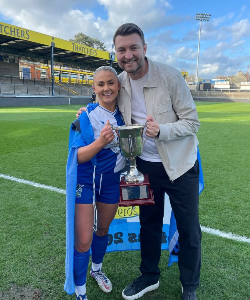 Gas Girls captain Libby Bell celebrates with Bristol Rovers CEO Tom Gorringe – photo: Libby Bell