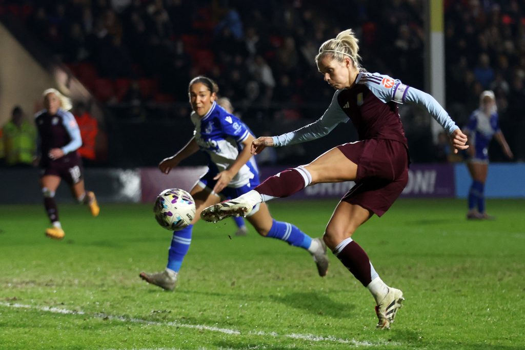 Rachel Daly strikes with Layah Douglas looking on – photo: Nathan Stirk / FA via Getty Images