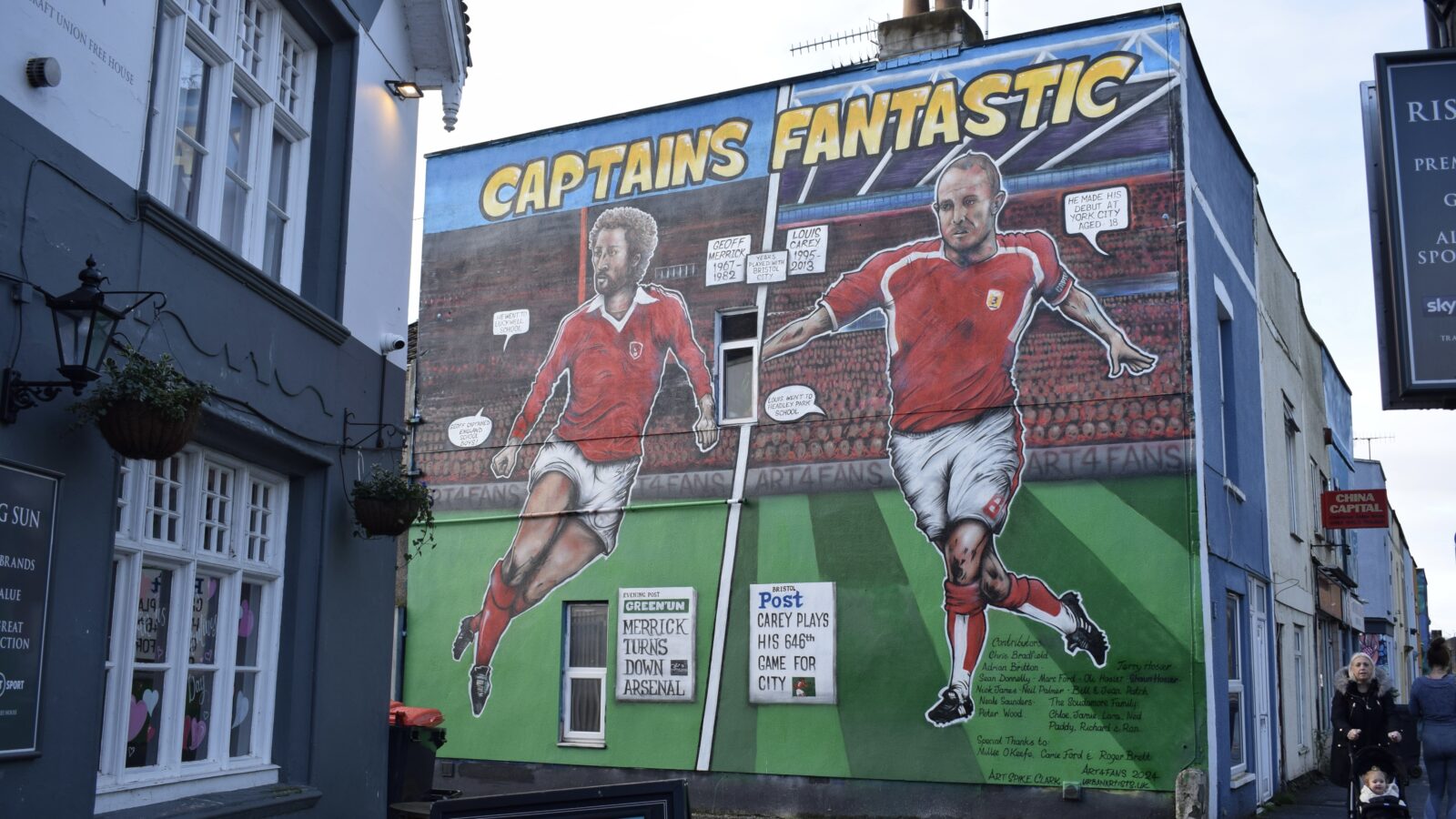 Geoff Merrick and Louis Carey join a mural a stone’s throw away of Bristol City legend Chris Garland on the side of Coopers Arms pub on Ashton Road, unveiled last October.