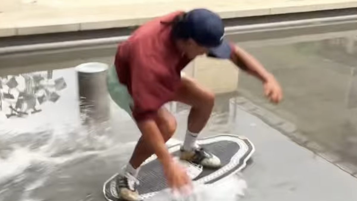 Usually seen full of children splashing about during the summer months and once home to two wicker whales, one of the water features in Millennium Square recently played host to a champion skimboarder.