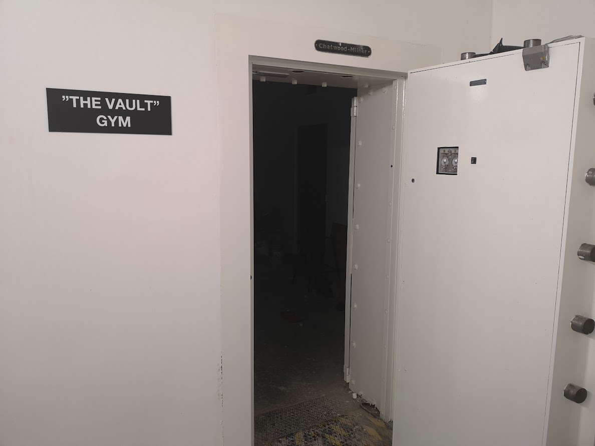 The vault from the basement of the bank was retained and repurposed as a gym space