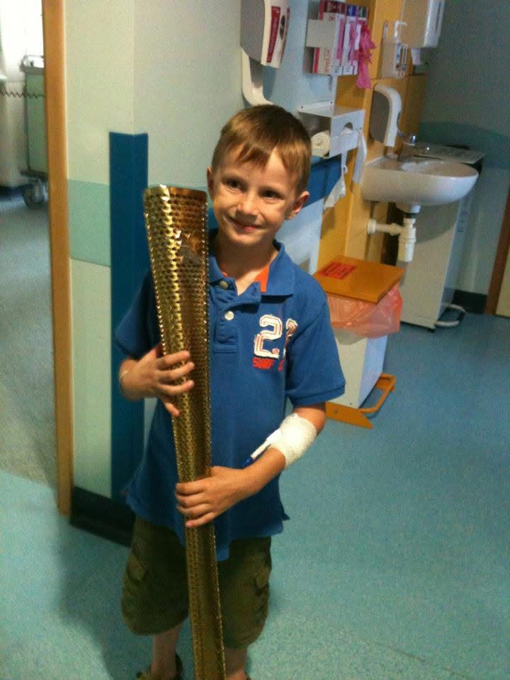 A young Finlay holding the Olympic torch as it made its way to the Olympic Stadium in time for the hosting of the olympic Games 2012