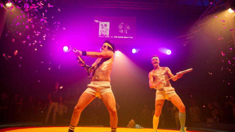 First to the stage, giving a spectacular opening performance, are a couple of model tennis players. The pair named ‘Balls Deep’, strut out onto the stage to Holding out for a Hero by Bonnie Tyler, strip off their tracksuits, toss them into an adoring crowd of friends and then fire glitter guns from their tennis rackets.