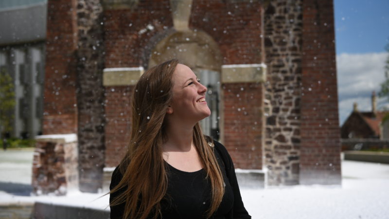 Student Lizzie Mould stands in the fake snow she created. Credit: Bhagesh Sachania
