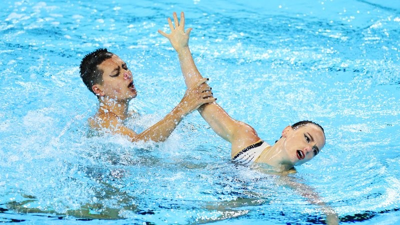 Izzy, a sports rehabilitation student at UWE Bristol, had to swap her graduation cap for a swimming cap as she competed in the mixed duet free final at the World Championships – photo: Karen Johnson