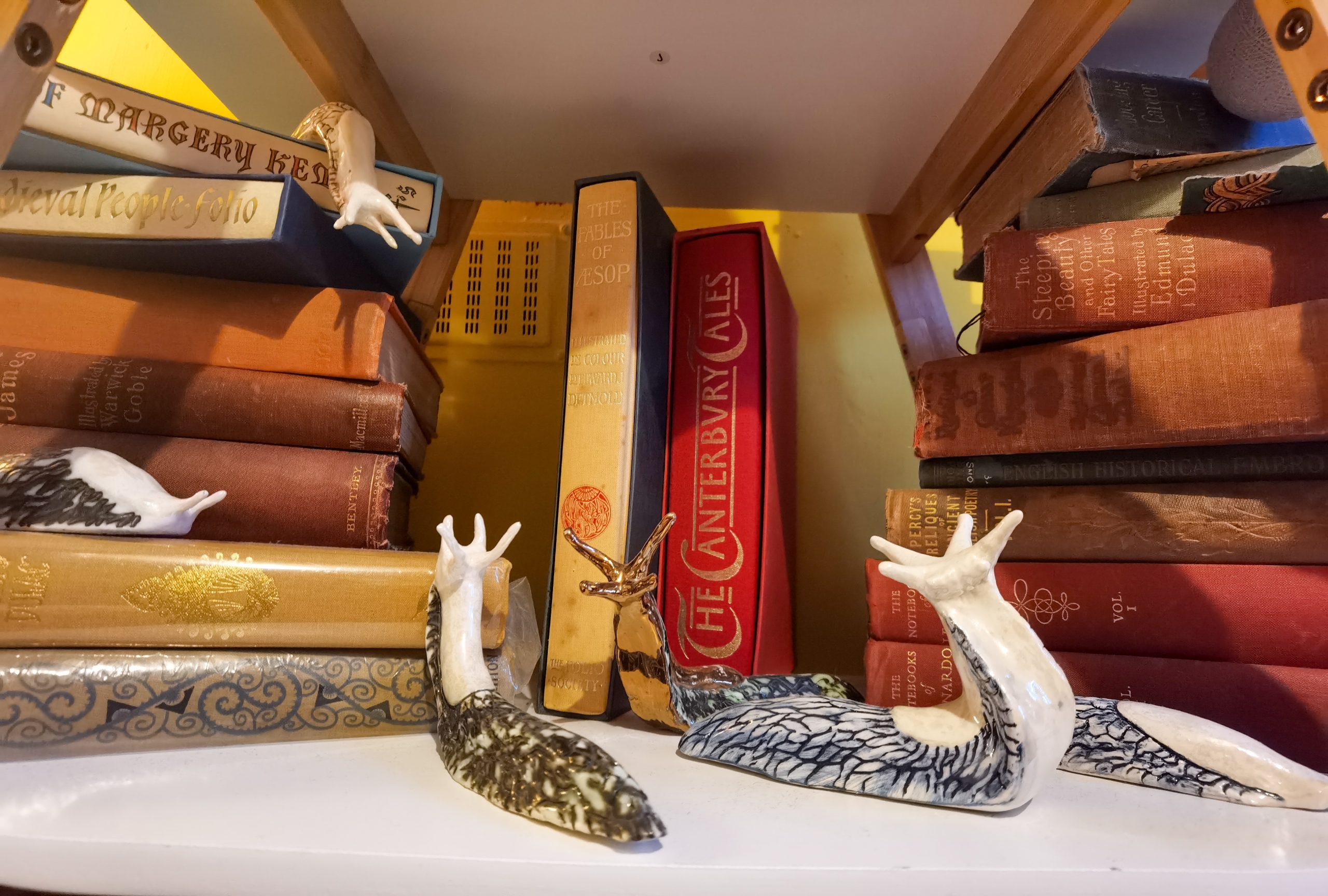 One example of New Wave’s work is a project where ceramic slugs, created by student Ripley Gosling (BA Illustration), crawl around books on a shelf. This sculpture was developed in partnership with the University of Bristol Botanic Gardens, and students create similar works to be exhibited and sold during the annual Easter Sculpture weekend.