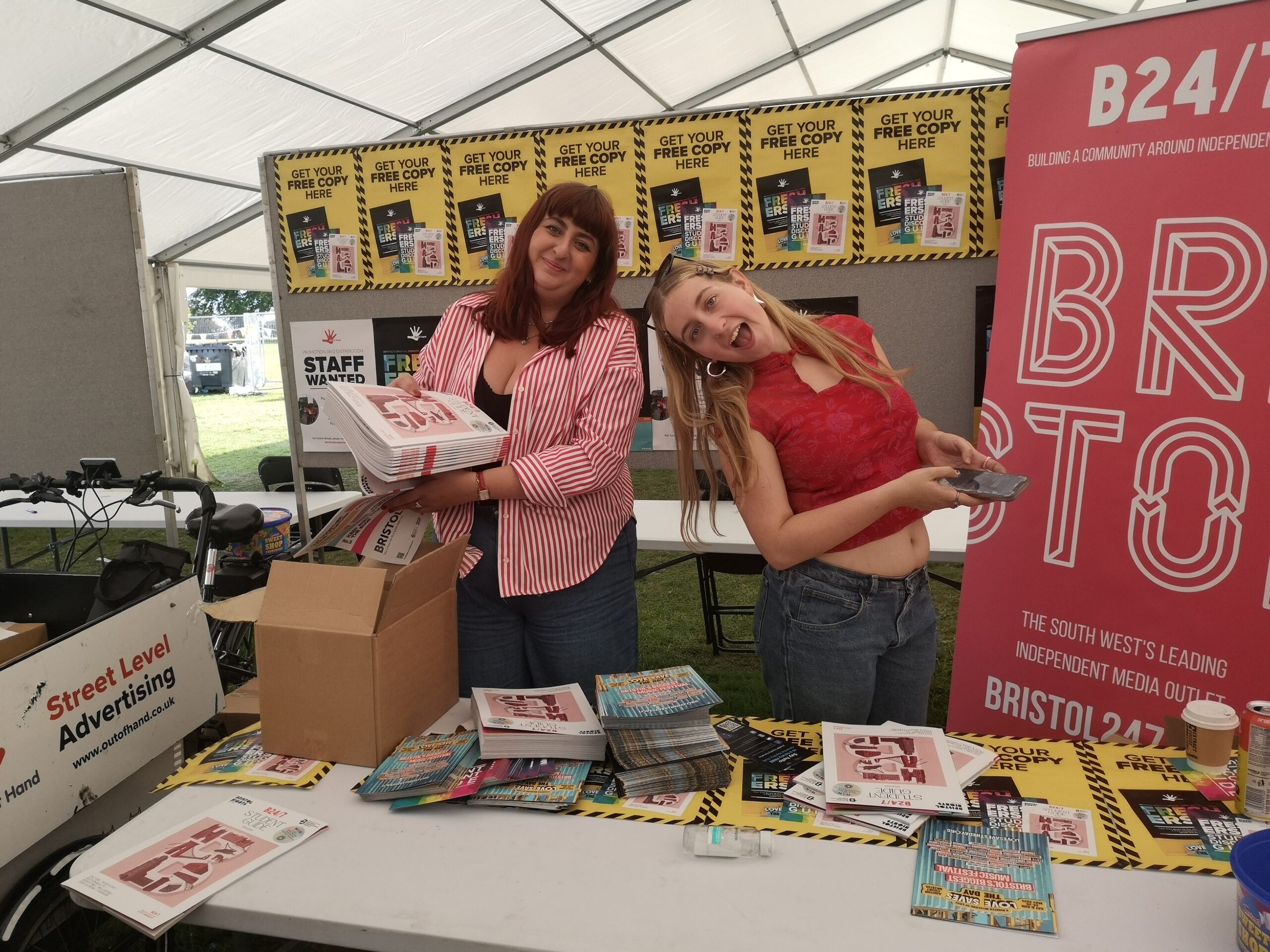 Student journalists Susie Long and Meadow Watteret attending to the Bristol24/7’s stall at Freshers Fair of Bristol University – photo: Milan Perera