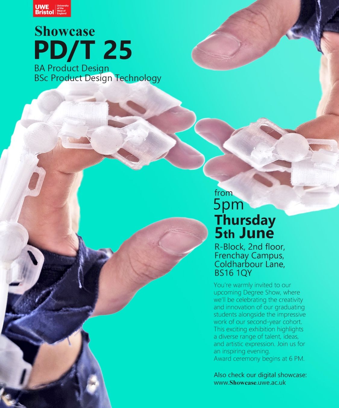 Kieran, a 22-year-old Product Design Technology student, will present Neuro Grip, a prototype bionic glove aimed at aiding stroke rehabilitation, at UWE Bristol’s annual Showcase.