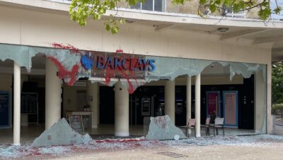 News / BroadmeadActivists smash windows of Barclays in BroadmeadRed paint was also daubed over the front of the bankRead more