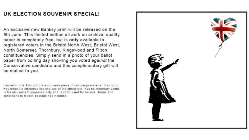 News / banksyBanksy offers print for those who vote against Tories in BristolBut is it legal?Read more