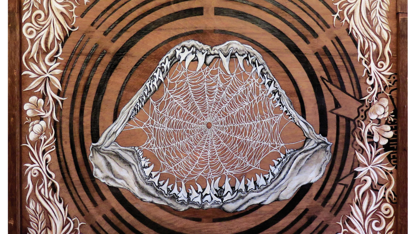 Pictured: detail from Dream Catcher (acrylic, ink on plywood case).