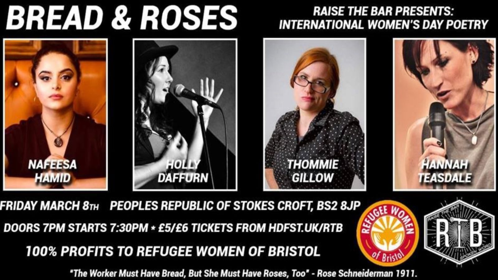 Raise the Bar present Bread & Roses – an International Women’s Day poetry fundraiser celebrating the strength and achievements of women and folks of other oppressed genders and raising money for Refugee Women of Bristol.