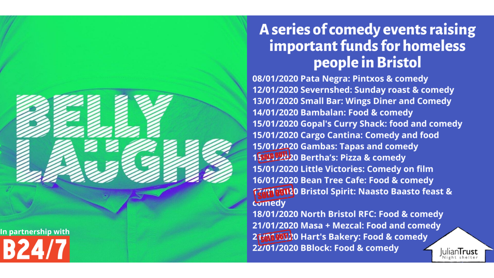 This January Belly Laughs in partnership with Bristol24/7 brings you a series of comedy gigs around Bristol with a difference. Held in independent restaurants, bars and cafes, Belly Laughs is a showcase of Bristol’s fantastic food and comedy talent with proceeds supporting The Julian Trust Night Shelter.