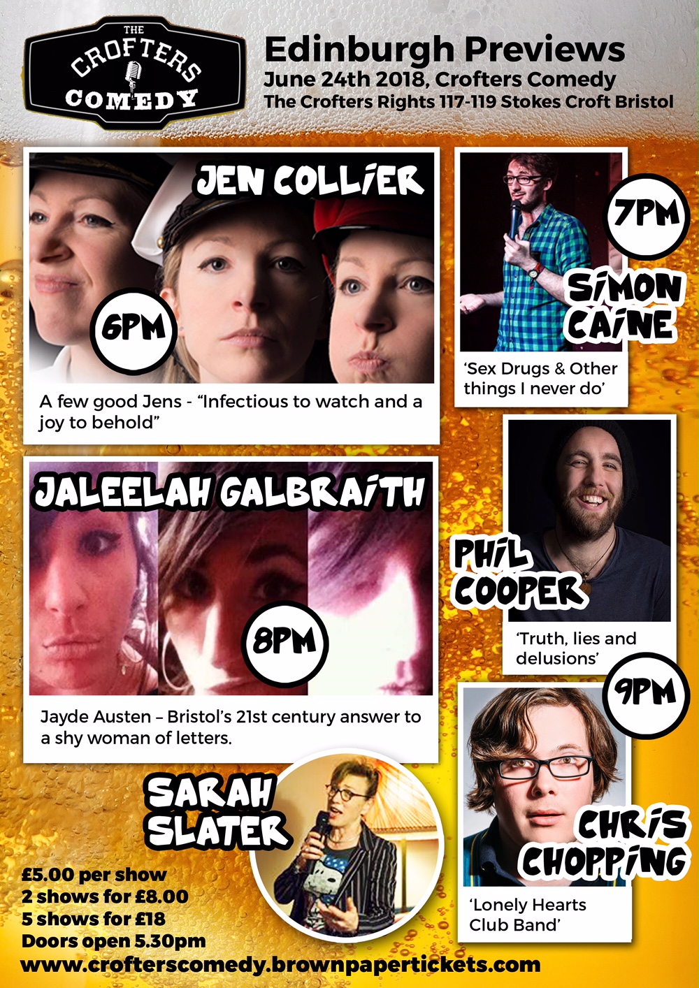 Some top comics including Jenny Collier and Chris Chopping roadtest their 2018 Edinburgh shows at The Crofters Rights. Sarah Slater is your genial MC.
