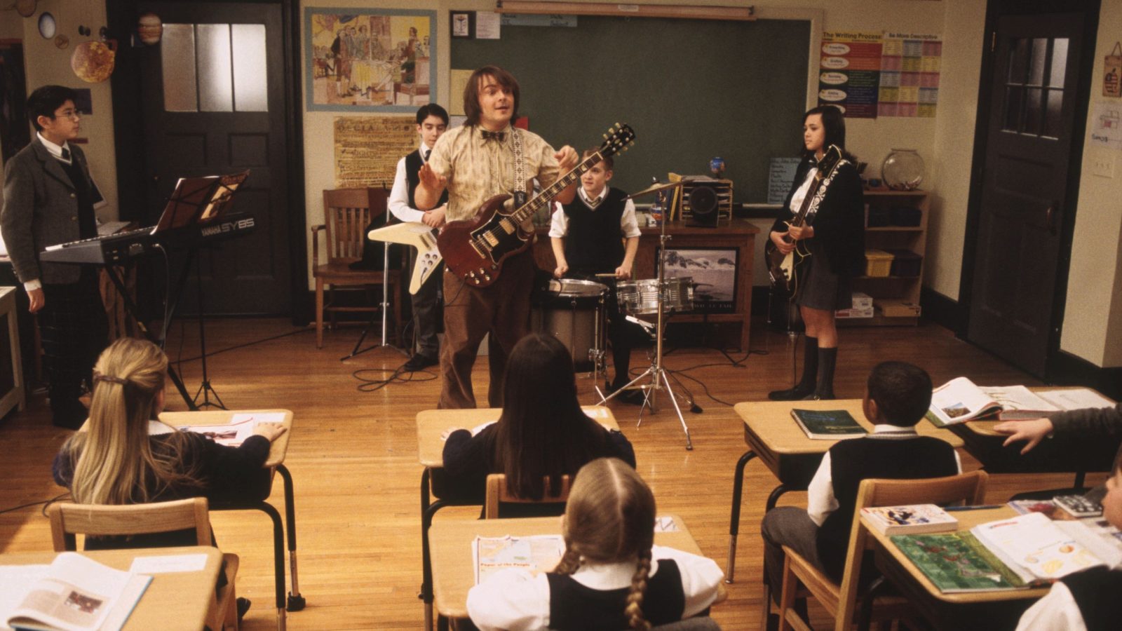 Thirtysomething Dewey Finn (Black) lives for rock. Unfortunately, it seems rock can get along just fine without him. At his lowest ebb, he finds himself kicked out of his own band for excessive guitar noodling and stage-diving. Even his oldest friend, the fabulously named Ned Schneebly (White), off whom Dewey’s been freeloading all these years, has given up on dreams of stardom and become a schoolteacher. “I serve society by rocking!” objects unemployed Dewey when his pussywhipped pal threatens him with eviction. Desperate for cash, he impersonates Ned and lands a job at an expensive private prep school run by prissy tightass Miss Mullins (Joan Cusack). Needless to say, he hasn’t the faintest idea how to teach and is suitably appalled to find that his 10-year-old charges’ musical taste stretches from P Diddy to Andrew Lloyd Webber. But when he discovers how musically talented they are, Dewey decides to tutor them in Rock Studies and secretly enter his class for a local Battle of the Bands contest. The blackboard is soon covered in ‘Rock Appreciation’ flowcharts, while homework consists of detailed study of Yes, Rush and Pink Floyd CDs.