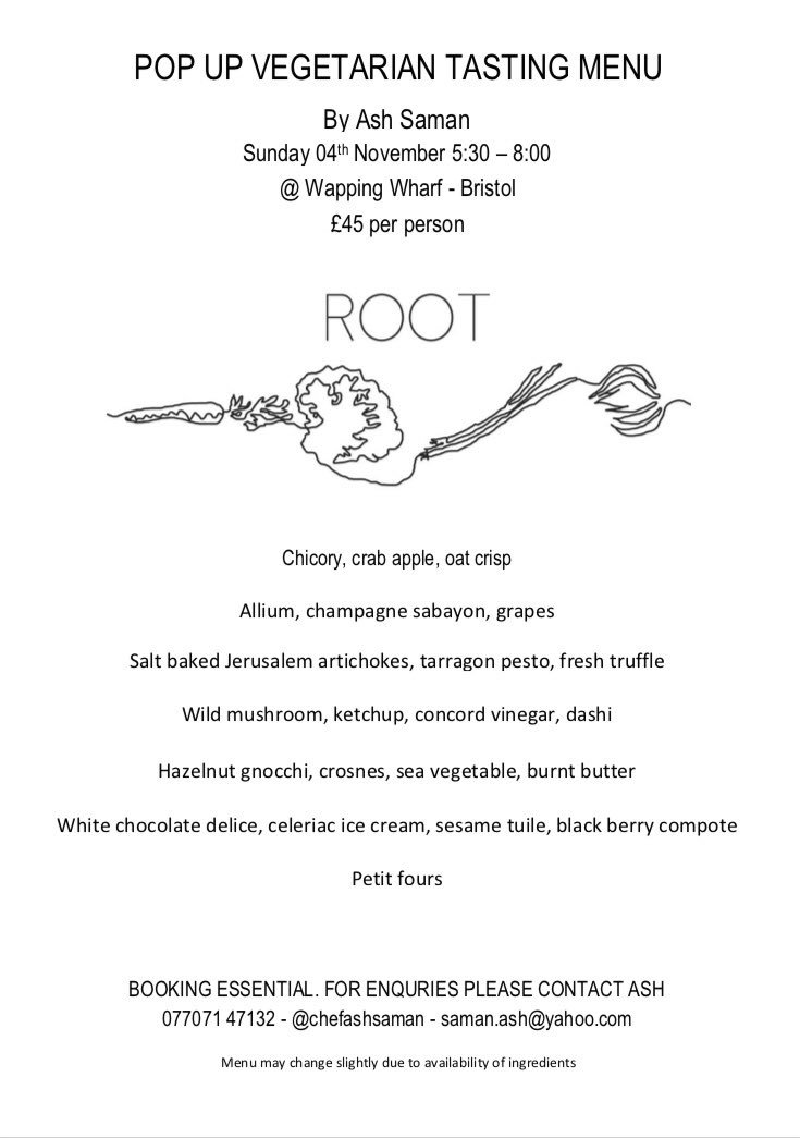Freelance chef Ash Saman, formerly at Casamia and The Chequers in Bath, presents his next pop-up dinner at Root in Wapping Wharf.